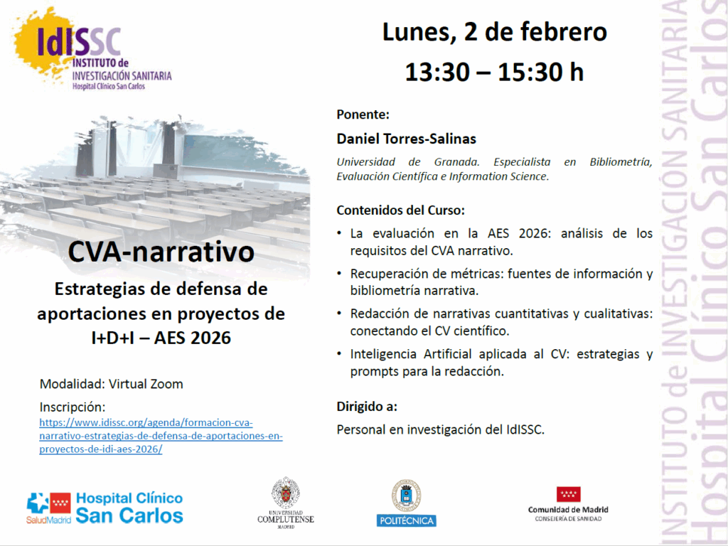Enmarcado en el Plan de Formación IdISSC 2026, el IdISSC organiza una sesión que intentará proporcionar herramientas, metodologías y estrategias para construir un CV. Integrará bibliometría, narrativas y asistencia de IA para optimizar la redacción de tu CV. La sesión se centra en la próxima convocatoria de proyectos por lo que tendrá una gran orientación práctica.