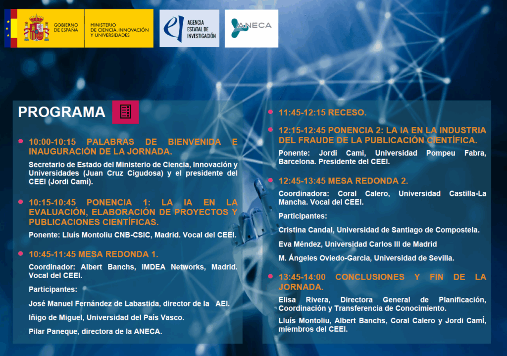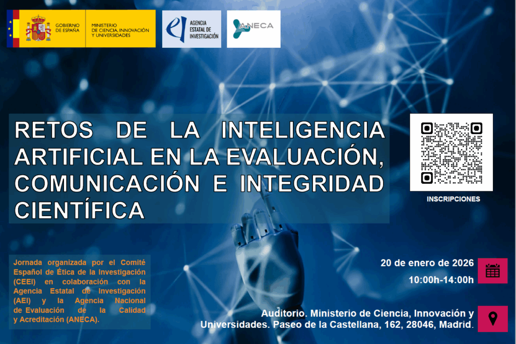 En nombre del Comité Español de Ética de la Investigación (CEEI), en colaboración con la Agencia Estatal de Investigación (AEI) y la Agencia Nacional de Evaluación de la Calidad y Acreditación (ANECA), y a través de la invitación de la Agencia Estatal de Investigación, tenemos el placer de remitirle la invitación a la jornada sobre los retos que presenta la inteligencia artificial en la evaluación, comunicación e integridad científica.