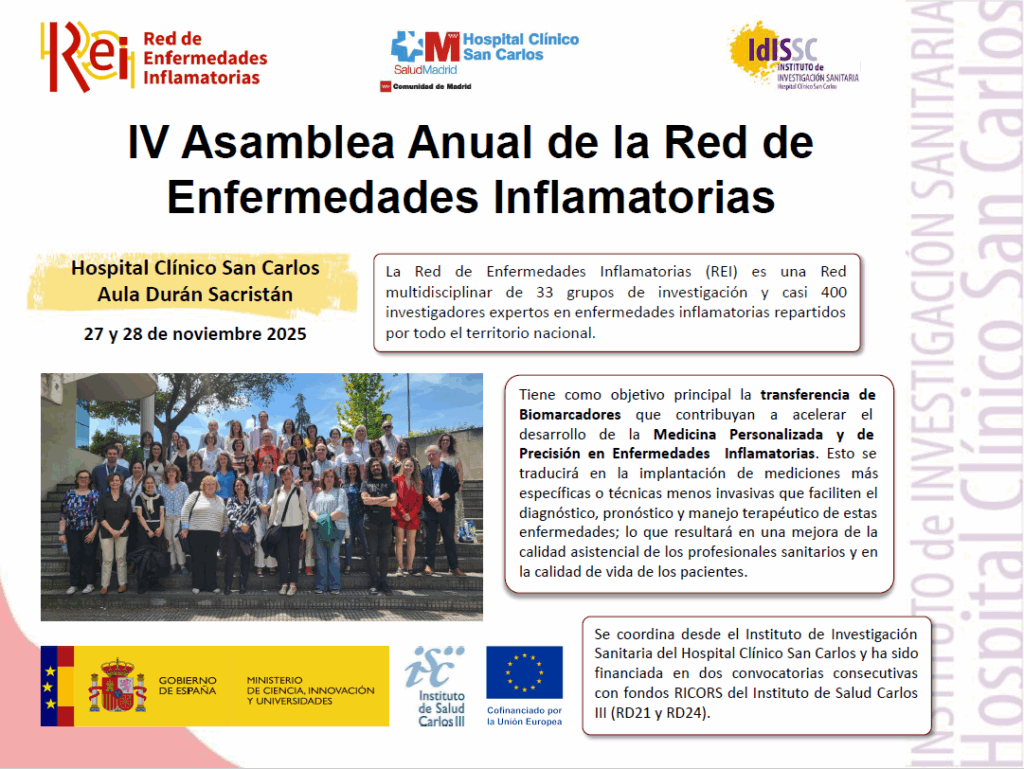 La Red de Enfermedades Inflamatorias (REI), financiada por el Instituto de Salud Carlos III, celebrará su tercera Asamblea Anual los días 27 y 28 de noviembre 2025 en el Hospital Clínico San Carlos (Madrid) esta vez de forma exclusivamente presencial. En ella se reunirán investigadores de los 31 grupos de investigación que la componen, ubicados en 12 Comunidades Autónomas.